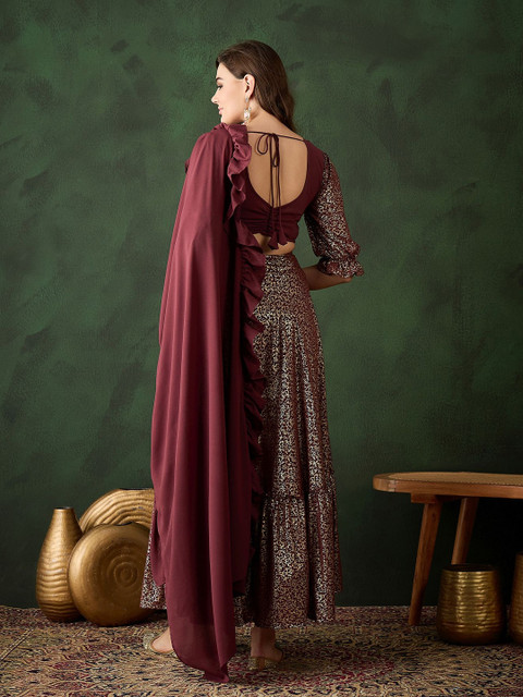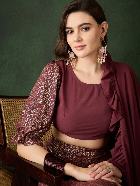 Burgundy colored embellished choli, has a Round neck, three quarter sleeves slip on closure