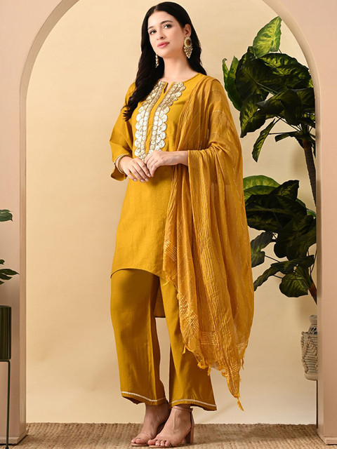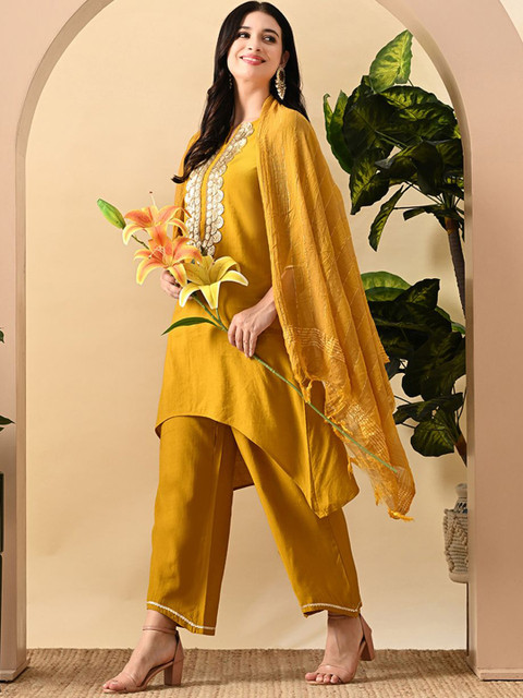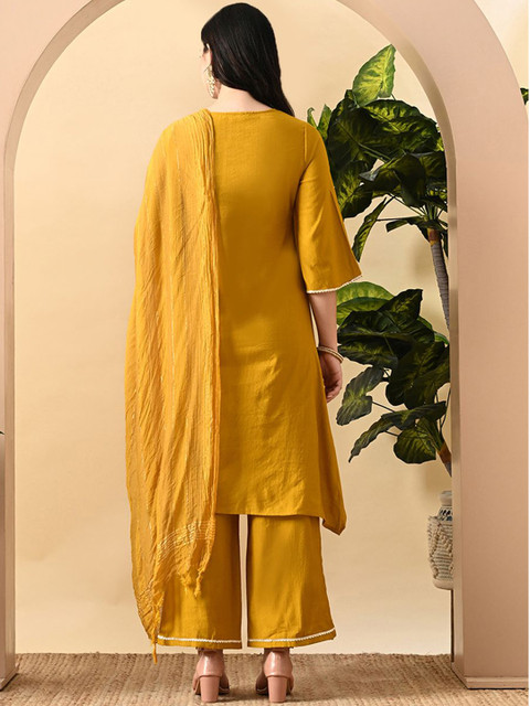 This kurta set consists of kurta, palazzo and dupatta