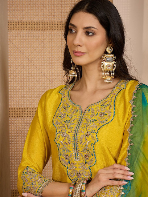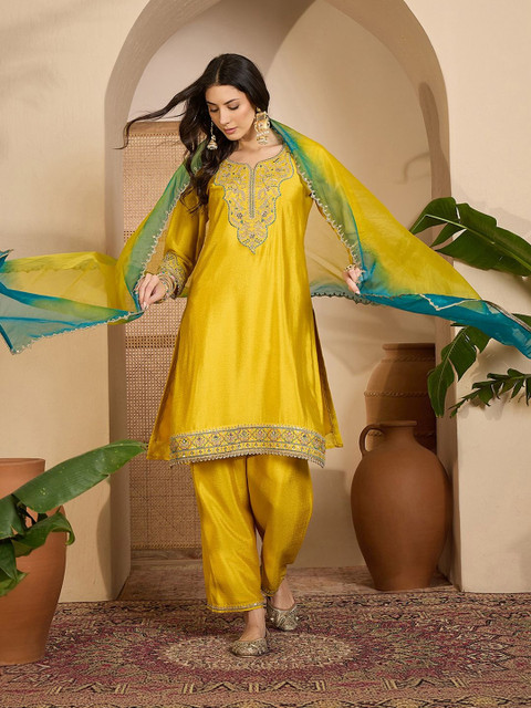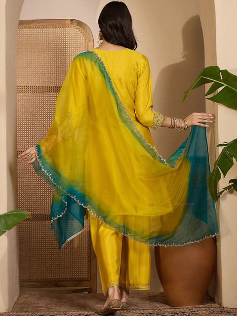 This kurta set consists of kurta, trousers and dupatta