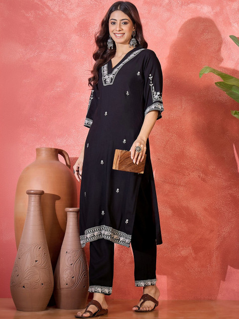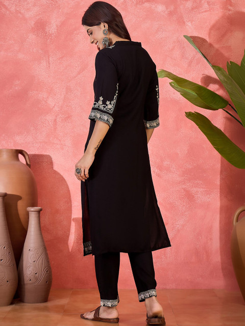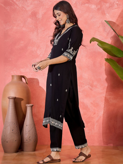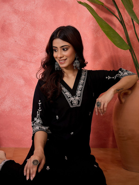 Black embroidered top, has a V collar neck and three quarter sleeves, secured with slip on closure