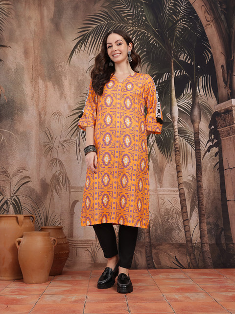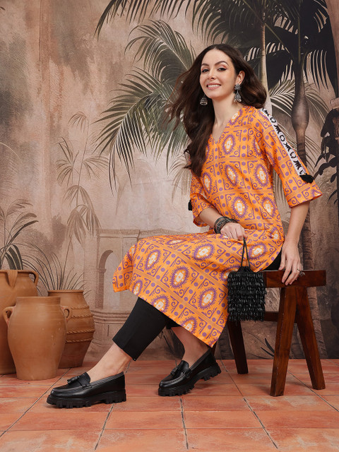 This bright kurta completes itself with its styled sleeves and vibrant. Its straight hem and print make it ideal for daily wear, pair it with any trousers and add a pair of oxidized earrings or chandbalis to complete the look.