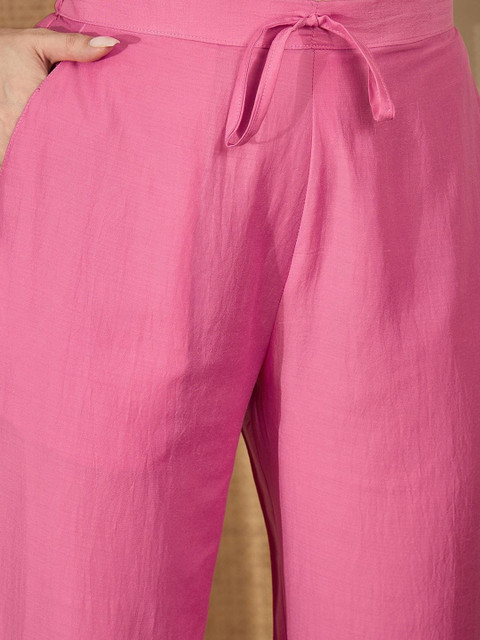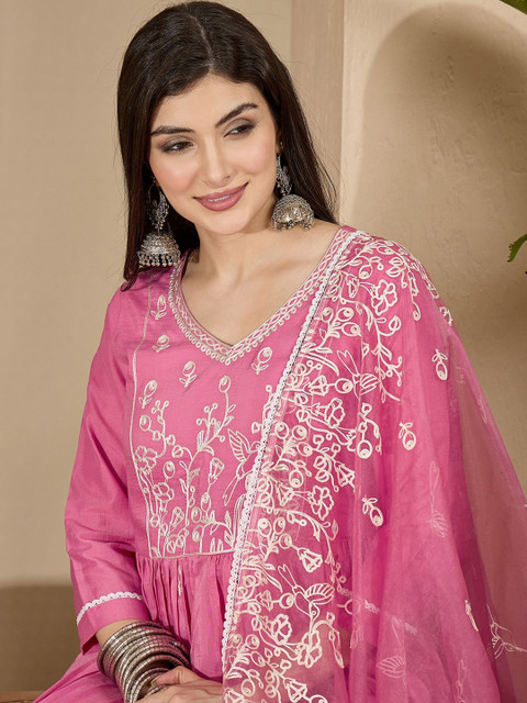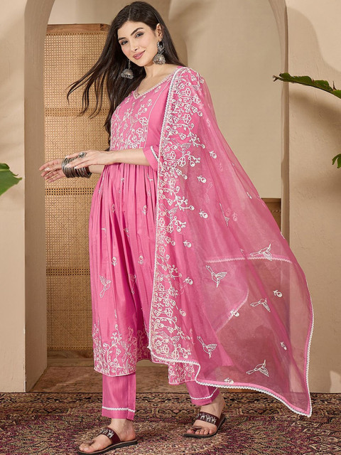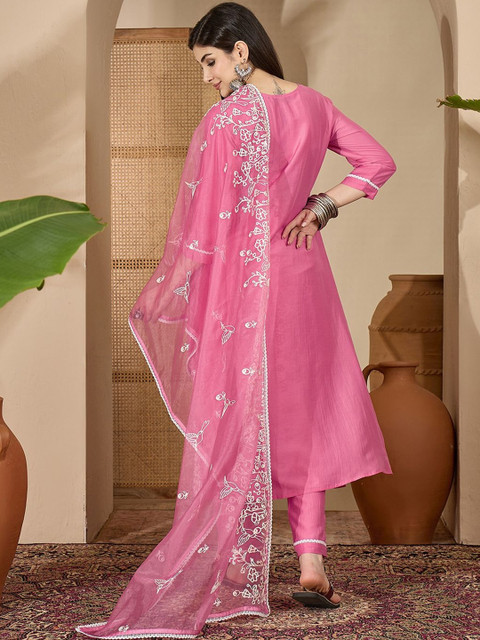 Pink, gold-toned and white embroidered kurta with trousers with dupatta