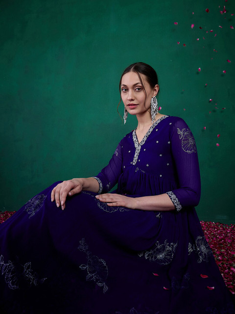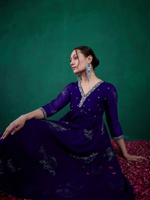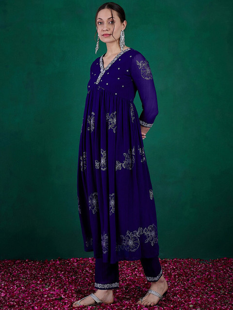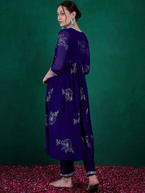 Sangria Floral Printed Embroidered Anarkali Kurta With Trouser