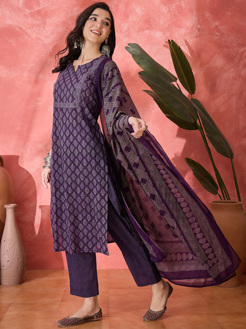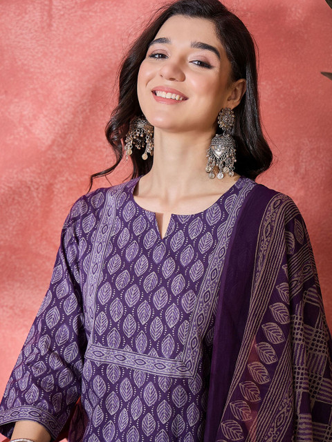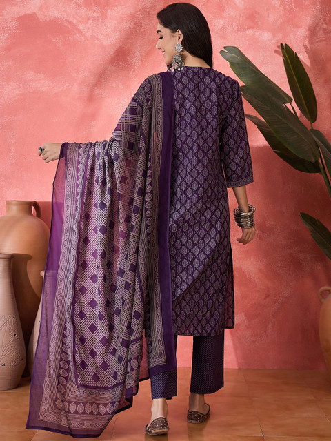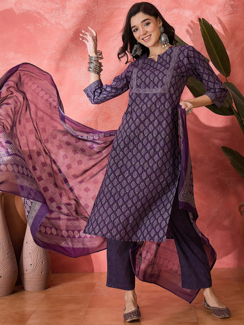 Violet and white kurta, trousers and dupatta