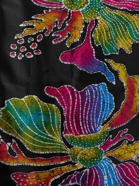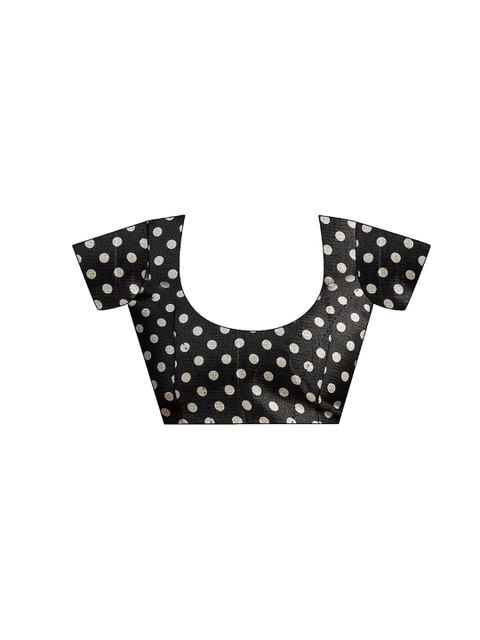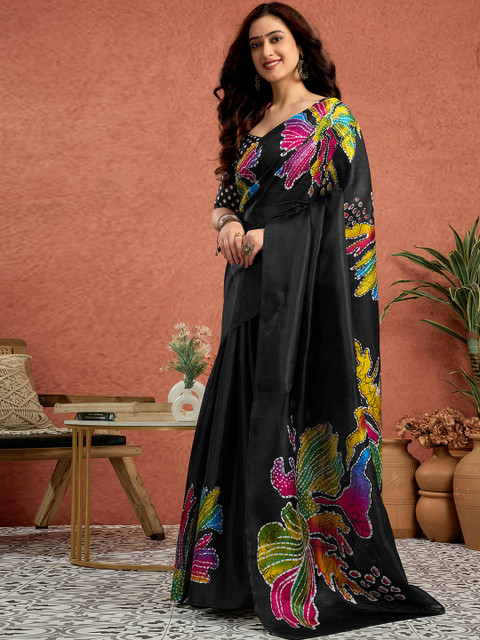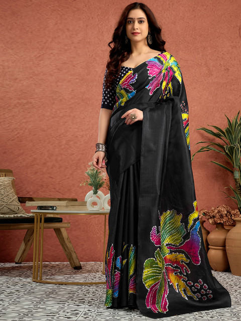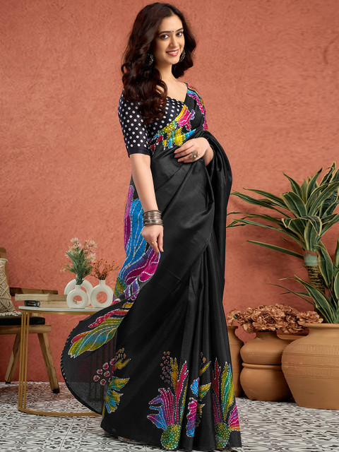 Floral printed sarees . Black saree is a must in your wardrobe and I think this is the one . The print is so different and pretty . It’s very elegant and chic saree . Blouse is polka dot . Combination is very nice . You can also wear a plain black blouse . Love this saree . Fabric is good . Fitting is nice . Looks very pretty .