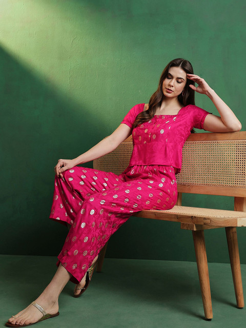 Fuchsia & gold toned printed top, has short sleeves, slip-on closure and regular waist hem