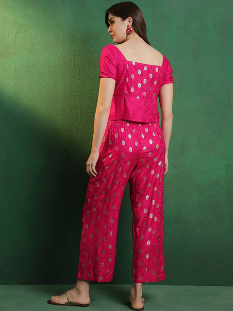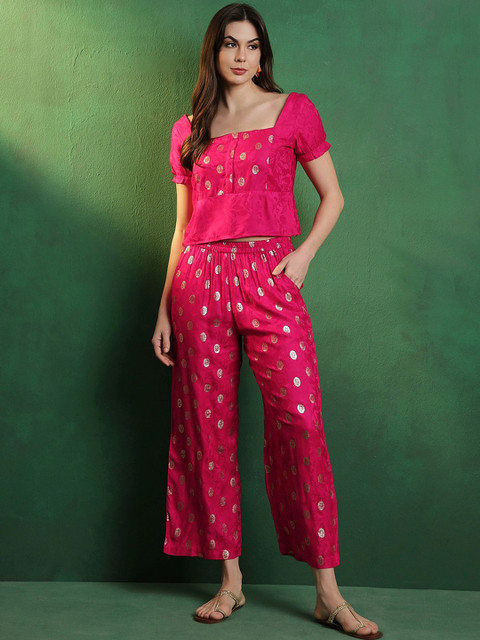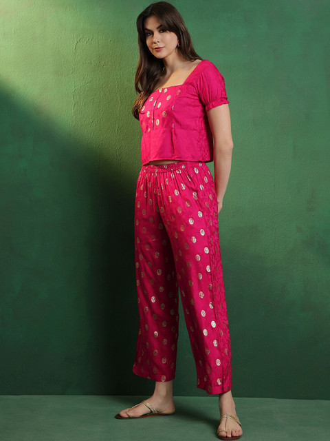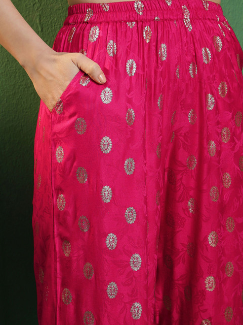 Fuchsia & gold toned printed mid-rise palazzo, has slip-on closure and straight hem