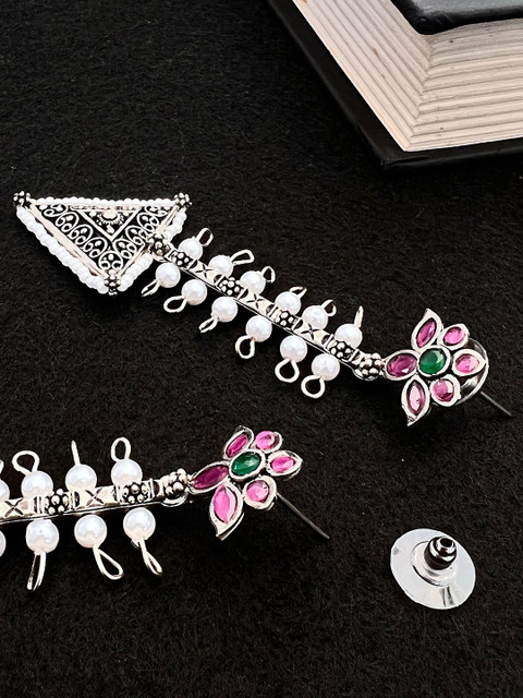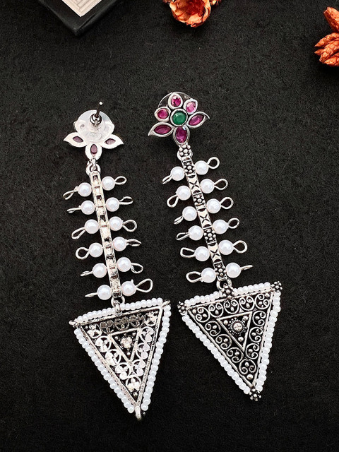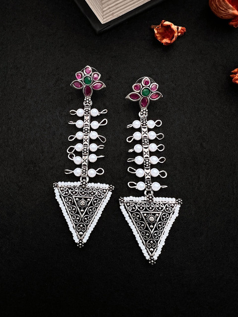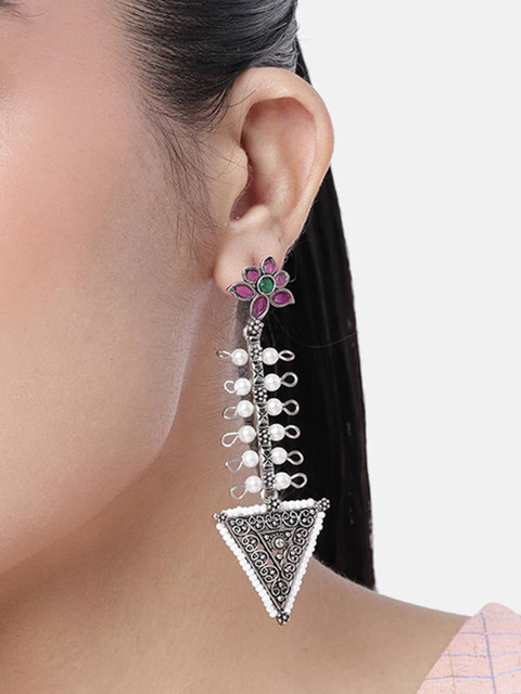 Silver-Plated drop earrings, has Pink stone-studded details