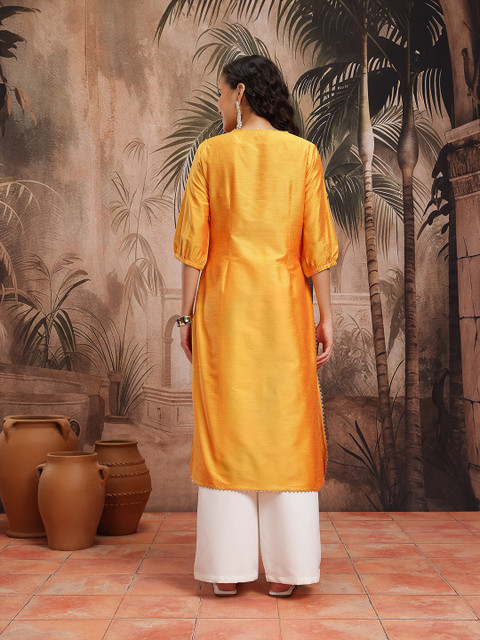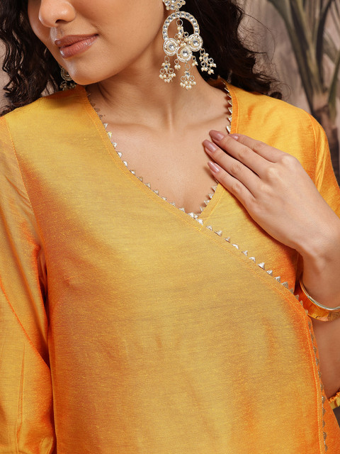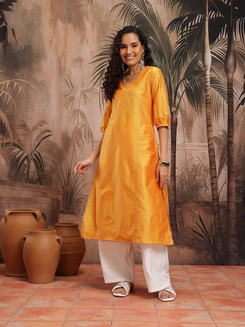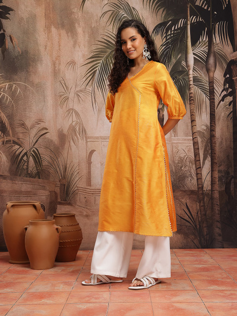This kurta is a must have in your closet. With the breezy silhouette and cheerful print and pattern, this kurta will become your favourite go-to outfit. Top it off with mojaris or heels for an aesthetic look.