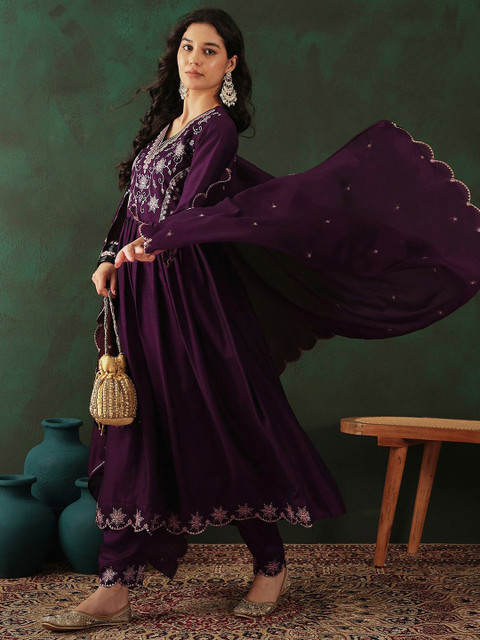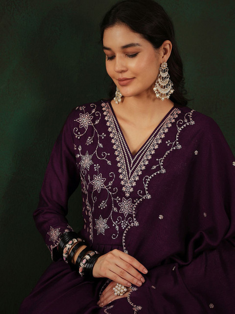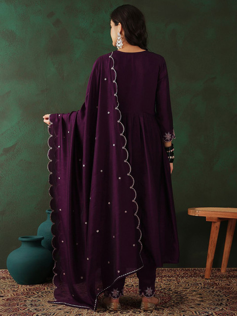 Magenta and gold-toned embroidered kurta with trousers and dupatta