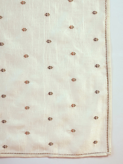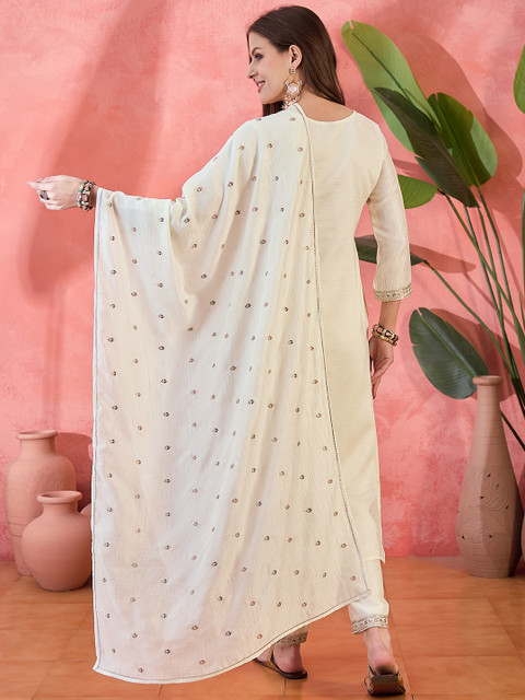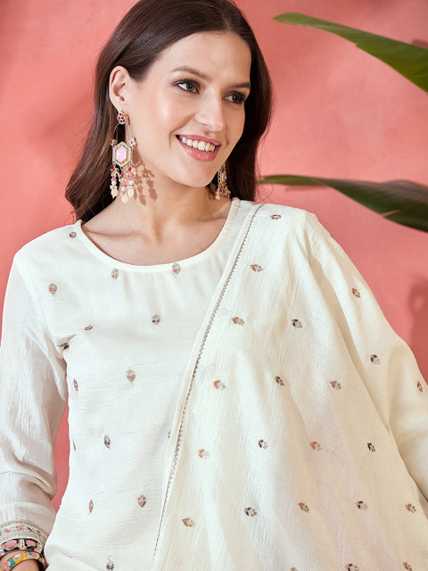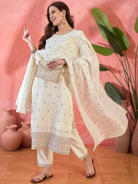 Sangria Off White Floral Embroidered Sequinned Straight Kurta With Trouser And Dupatta