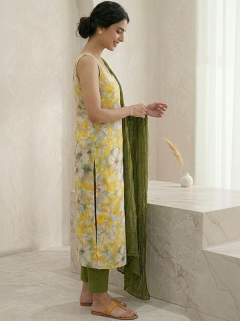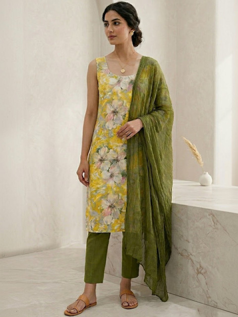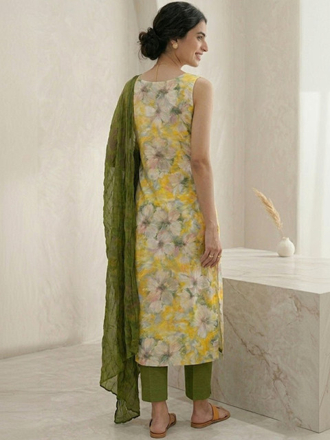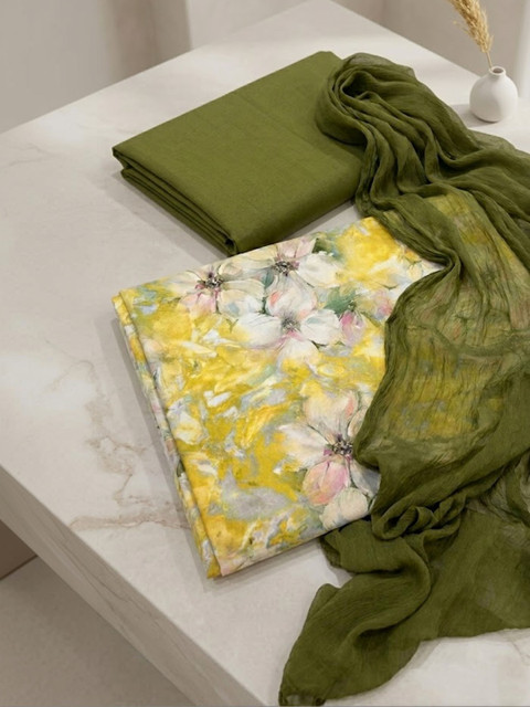 Yellow and olive green printed unstitched dress material