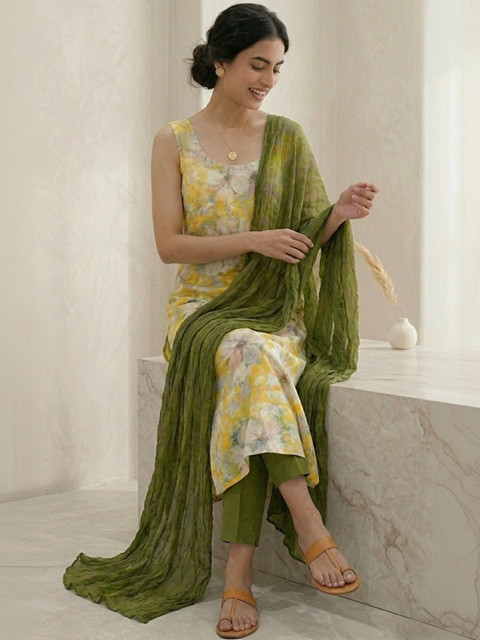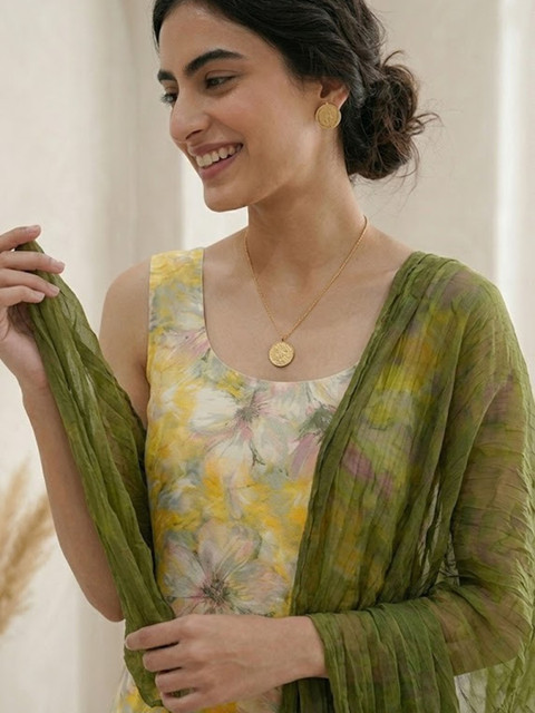 yellow and olive green printed kurta fabric