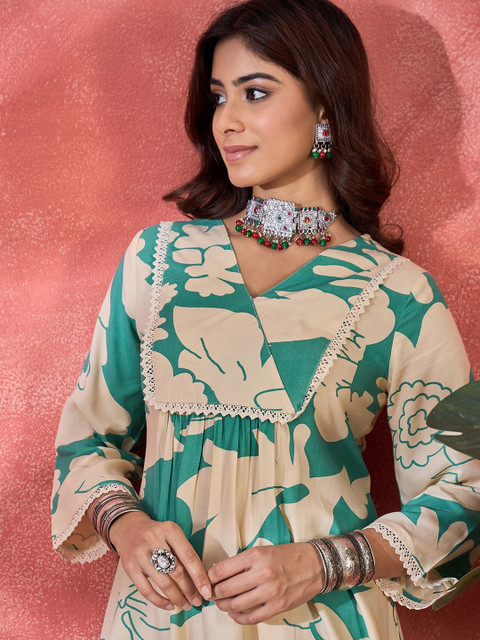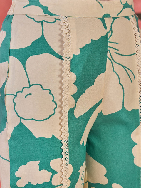 Green printed trouser, has an elasticated waistband with slip-on closure