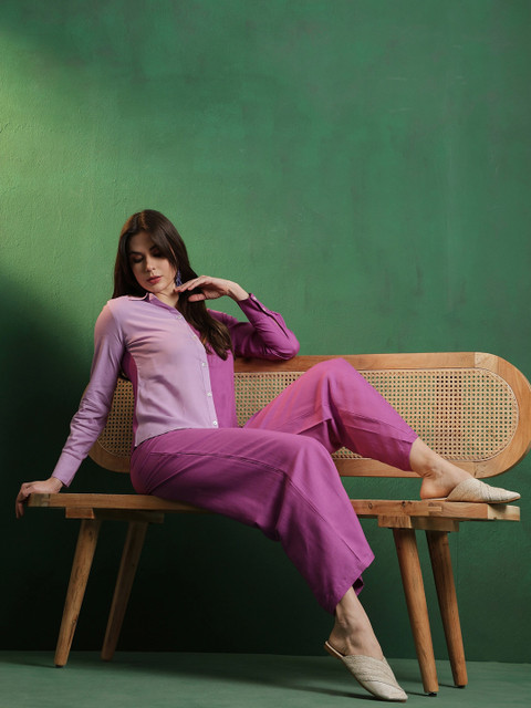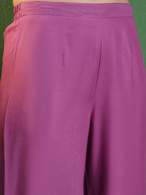 Purple solid palazzo, has an elasticated waistband, flared hemline and slip-on closure.