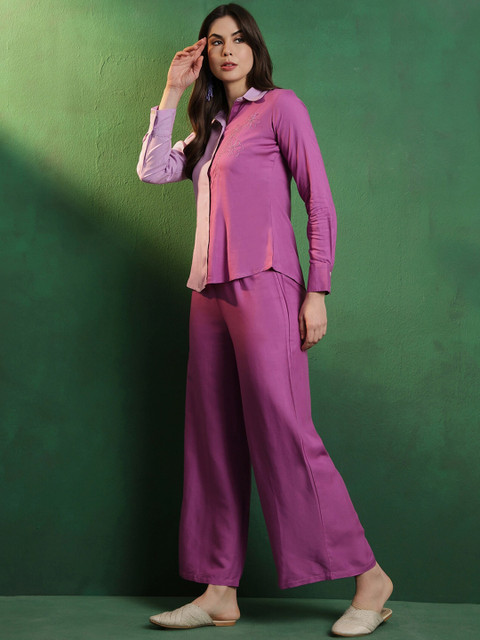 Purple embroidered shirt, has a shirt collar neck, open button closure and long sleeves