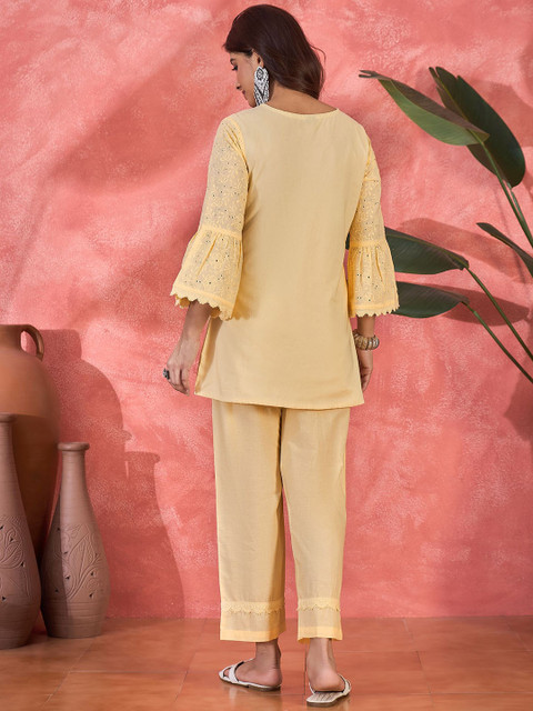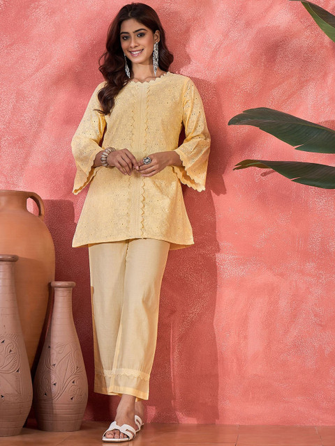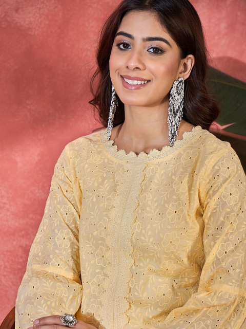 Yellow embroidered top, has a round neck, and three-quarter sleeves, secured with slip on closure