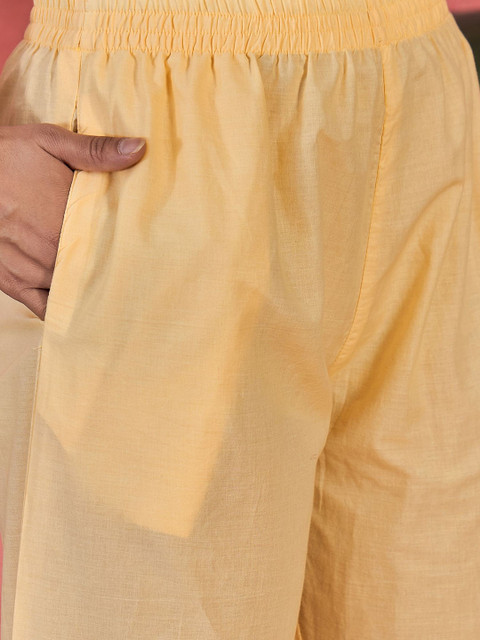 Yellow solid trousers, has an elasticated waistband with slip-on closure