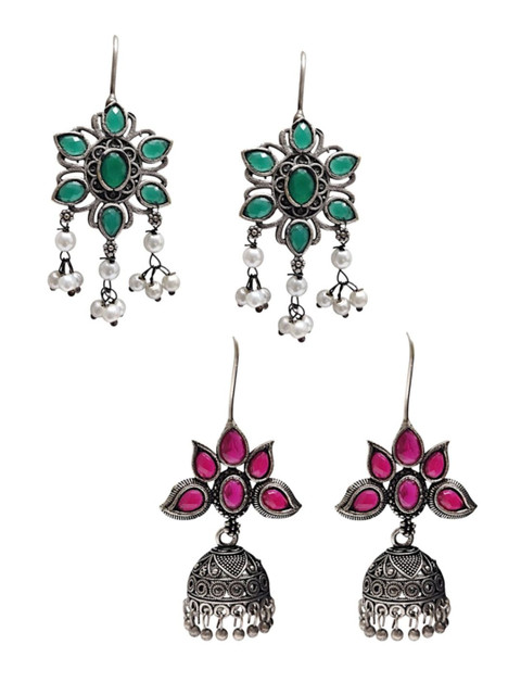 Silver toned jhumka and drop earrings, has green and maroon stone-studded details