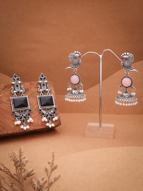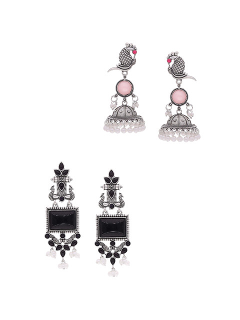 Set of 2 Silver-toned, black & pink contemporary drop earrings, silver-plated, has artificial stones studded and beaded details
