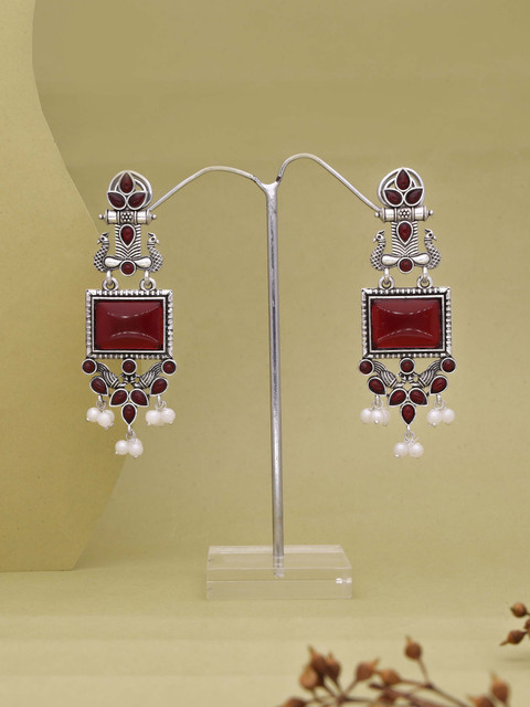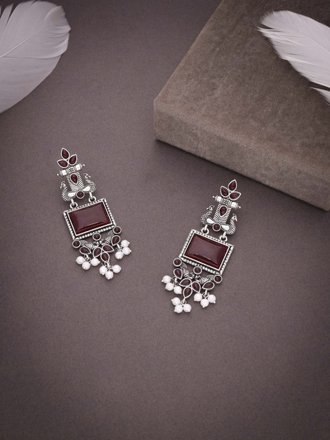 Silver-toned, maroon and white square shaped drop earrings, Silver-plated, has artificial stones and beads details