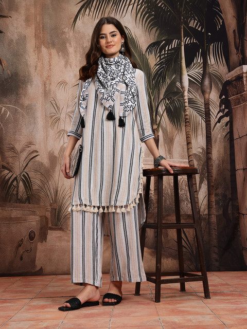 2 reviews for Sangria Striped Pure Cotton Kurta With Palazzos & Dupatta