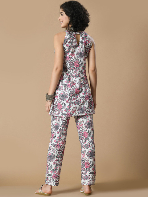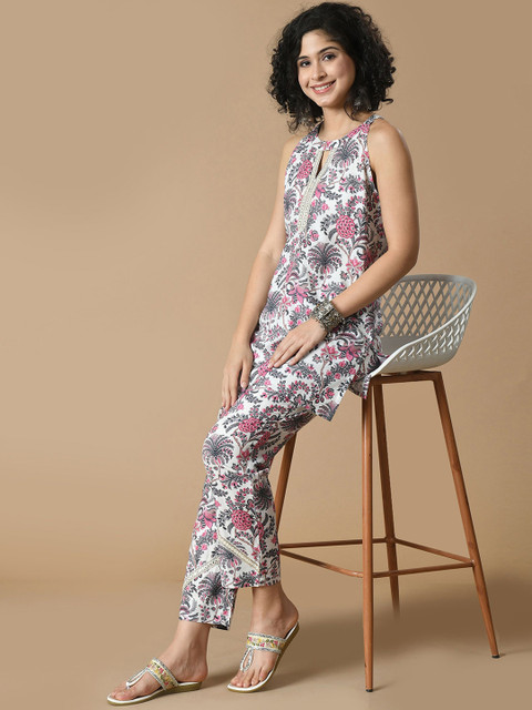 White & pink floral printed tunic, has a round neck and sleeveless, secured with slip-on closure