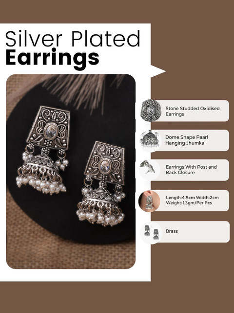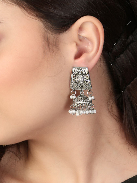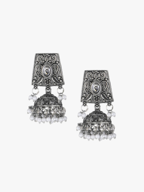 Silver-toned and white dome shaped jhumkas, has artificial stones studded and pearls beaded details