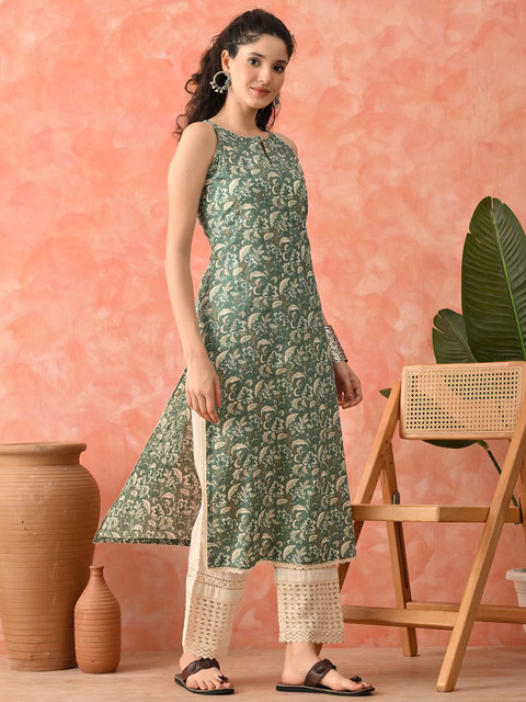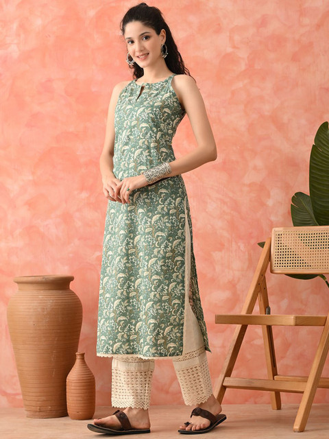 Sangria Women Floral Printed Cotton Kurta with Trousers
