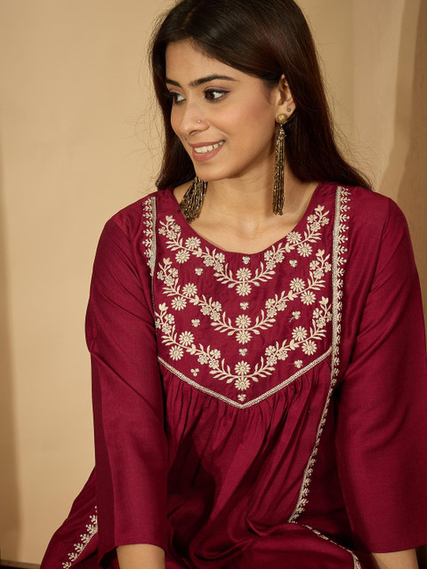 Maroon Chinon silk Embroidered Tunic with Palazzos,Round Neck,Three Quarter sleeves,Waist Line Top,Frilles on Yoke,Bottom:Chinon Silk Solid Bottom With Side Embroidery,Slip on Palazzos