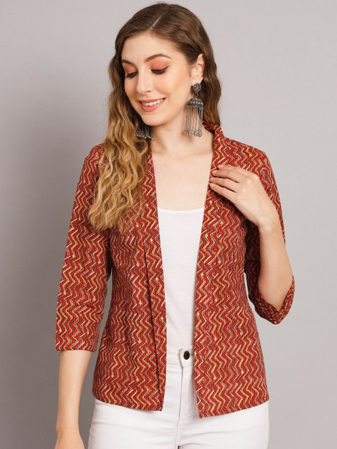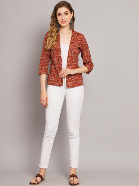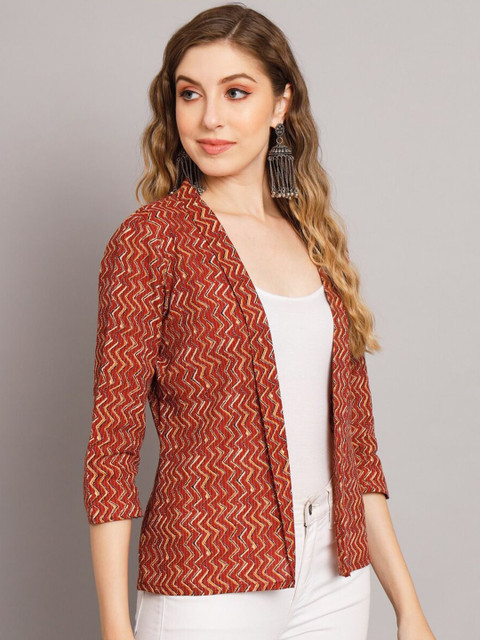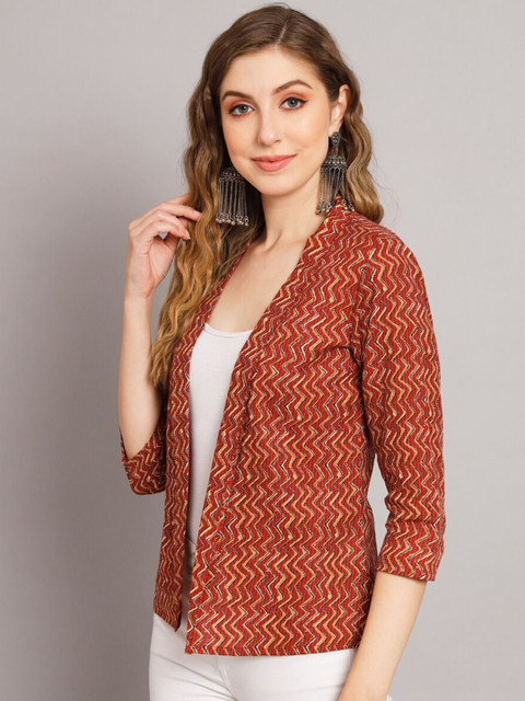Maroon and cream-coloured printed open front regular shrug ,has three-quarter sleeves, straight hem