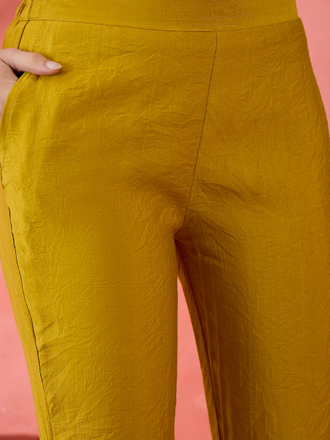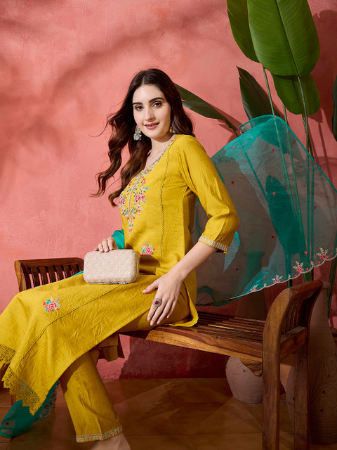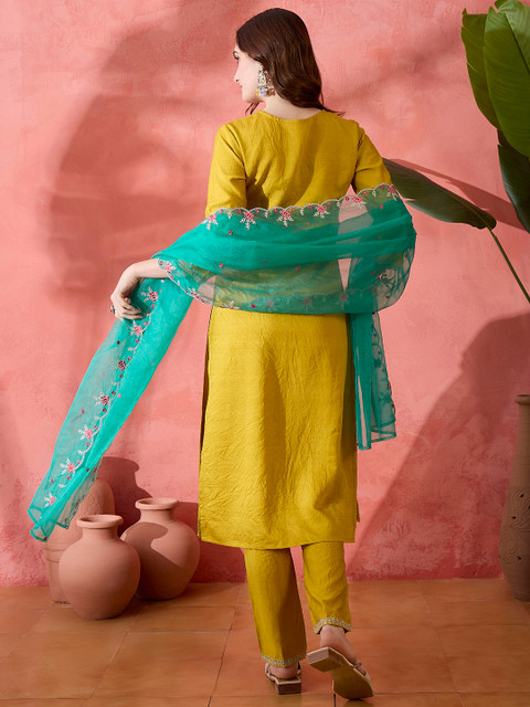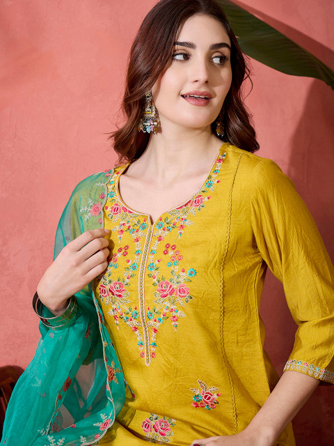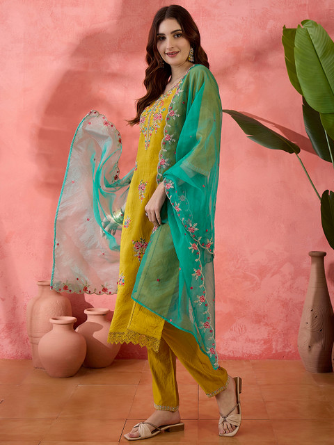 Yellow, green and pink embroidered kurta with trouser and dupatta