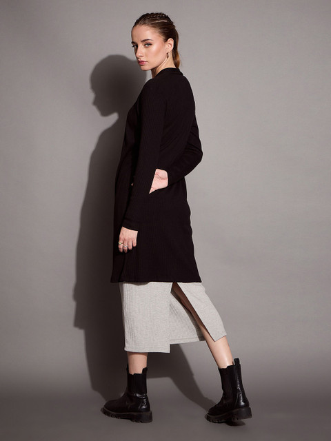 Black solid open front longline shrug ,has long sleeves, straight hem