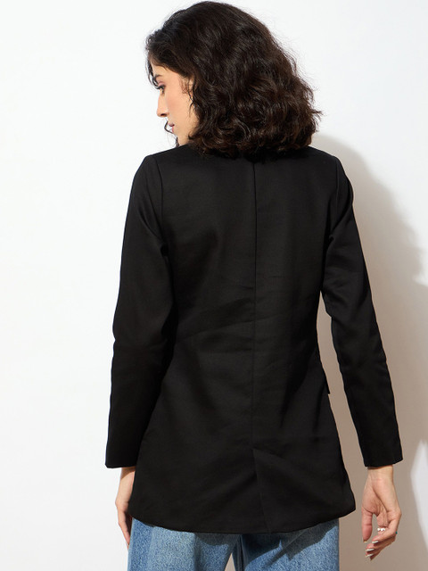 Black solid comfort-fit casual blazer, has a notched lapel, long sleeves, double-breasted with double button closure, two flap pockets and a ventless back hem