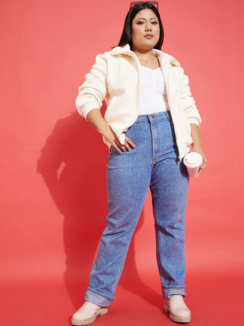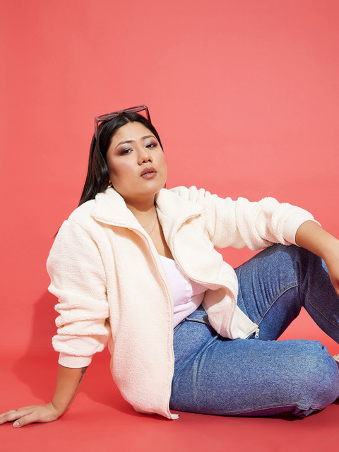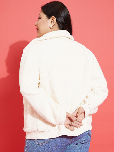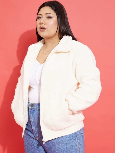 3 reviews for SASSAFRAS Curve Plus Size White Self Design Mock Collar Bomber Jacket