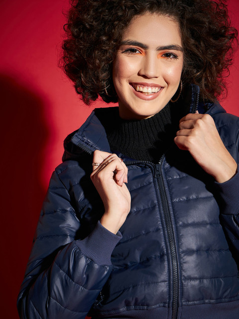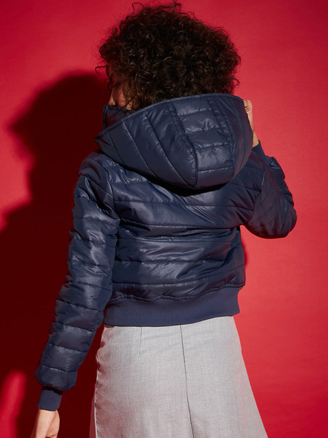 Navy blue solid puffer jacket, has a hooded, 2 pockets ,has a zip closure, long sleeves, straight hemline, polyester lining