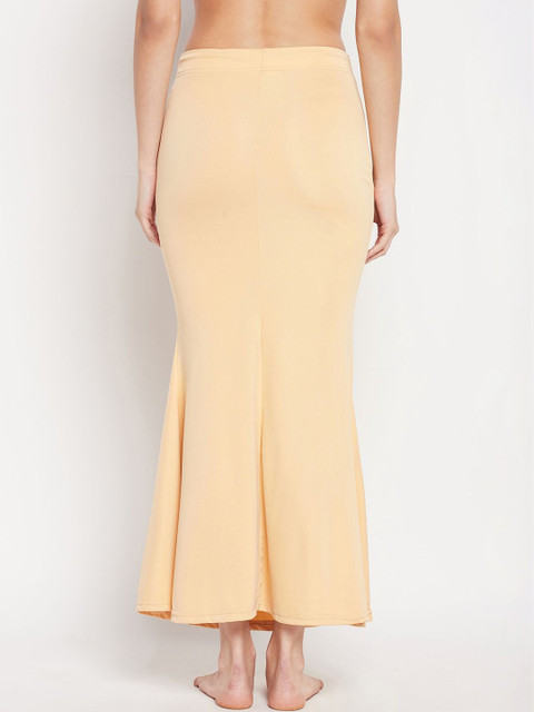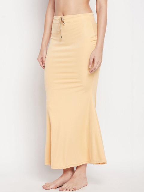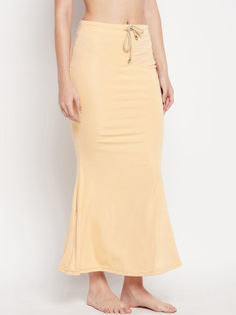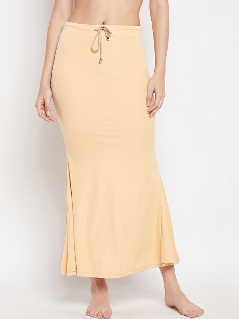 Women nude solid saree shapewear, has an elasticated waistband with drawstring closure, seamless mermaid fit, stretchable fabric for utmost comfort, and side slit for easy movement.