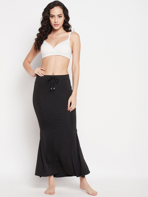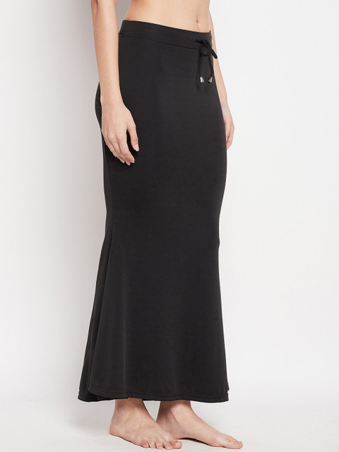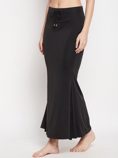 Women black solid saree shapewear, has an elasticated waistband with drawstring closure, seamless mermaid fit, stretchable fabric for utmost comfort, and side slit for easy movement.