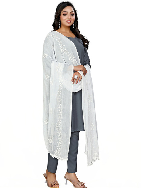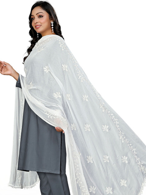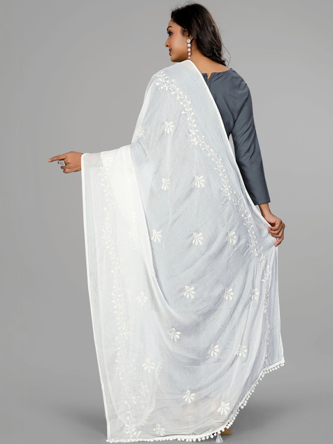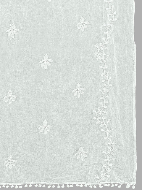 White Floral Embroidered dupatta has Ikat technique, Thread Work, Tasselled border