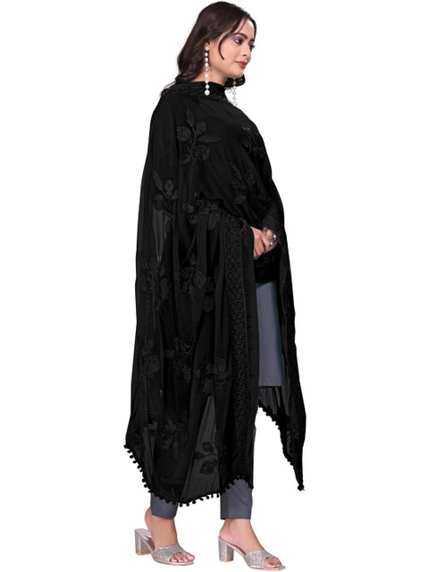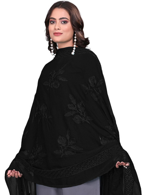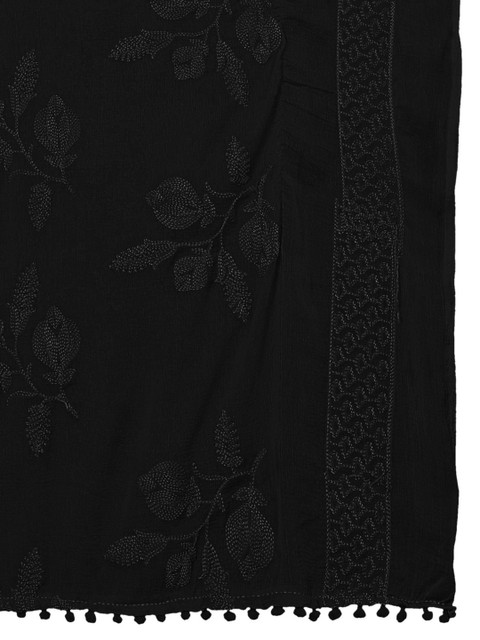 Black Floral Embroidered dupatta has Ikat technique, Thread Work, Tasselled border