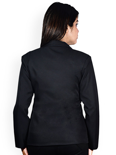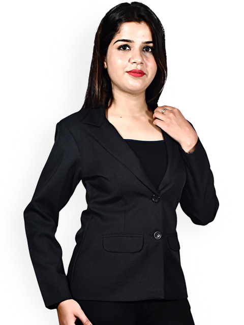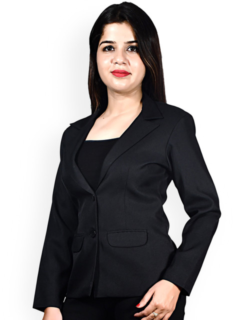 Black solid regular-fit formal blazer, has a notched lapel, long sleeves, single-breasted with double button closure, two pockets, a ventless back hem
