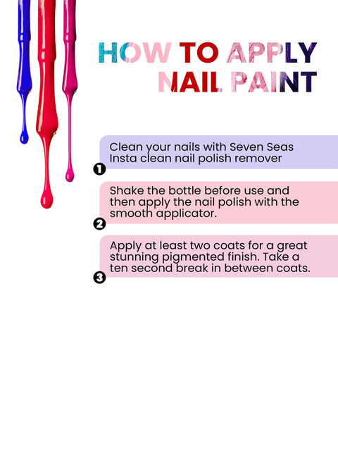 | How-to-Apply | Clean your nails with seven seas nail polish removerShake the bottle before use and apply the nail polish with smooth applicatorApply at least two coats for a great stunning pigmented finish. Take a ten second break in between coats |