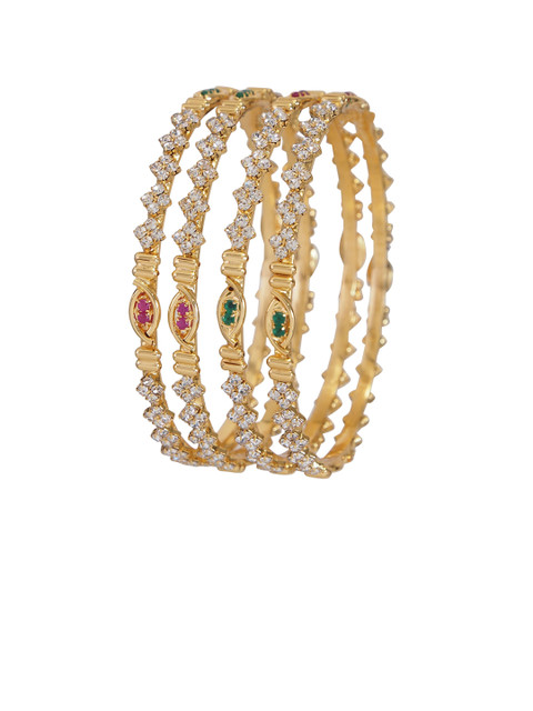 Set of 4 Gold-plated bangles, each has green, pink and white AD-studded details, secured with slip-on closure