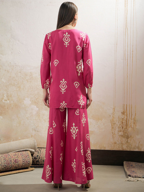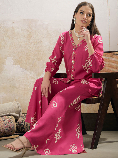 Pink and beige ethnic motifs printed shirt, has a V-neck, three quarter sleeves, button closures,has gotta patti details