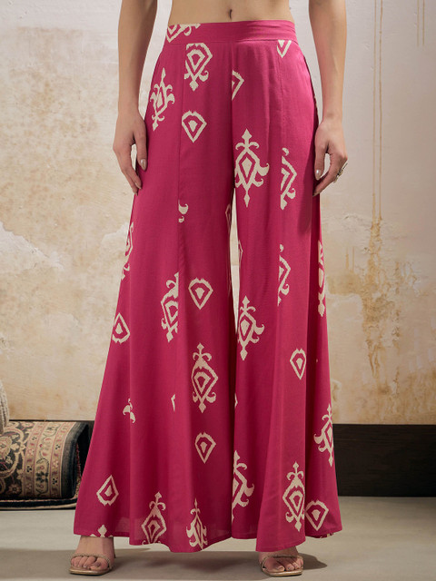Pink and beige ethnic motifs printed mid-rise palazzos, has elasticated waistband with slip-on closure