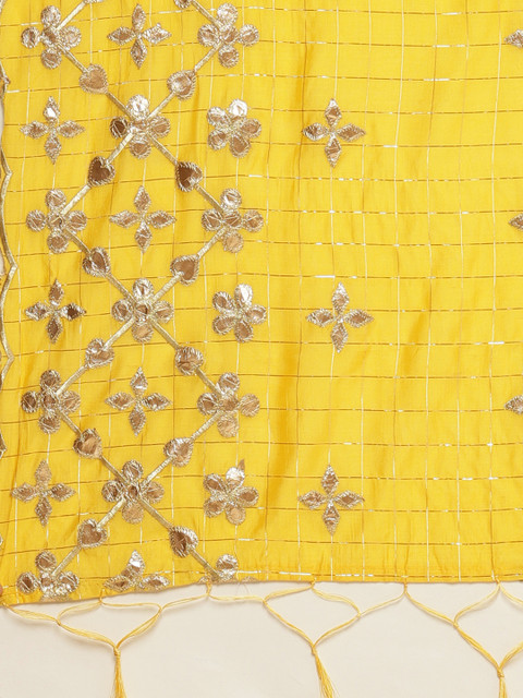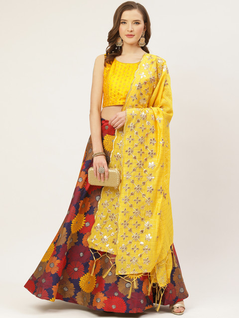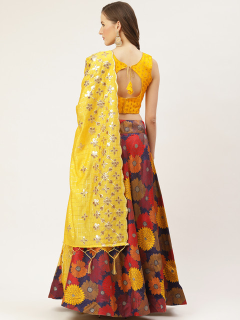 Navy, yellow and red lehenga choli with dupatta, has zari work