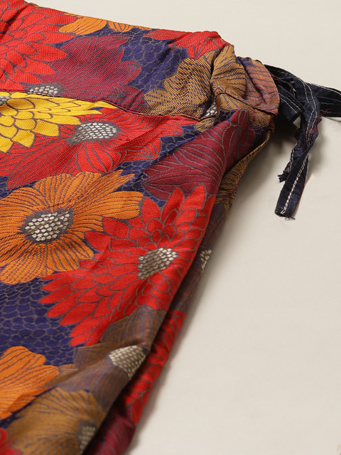 Navy, red and yellow woven design semi-stitched lehenga, has drawstring closure, flared hem