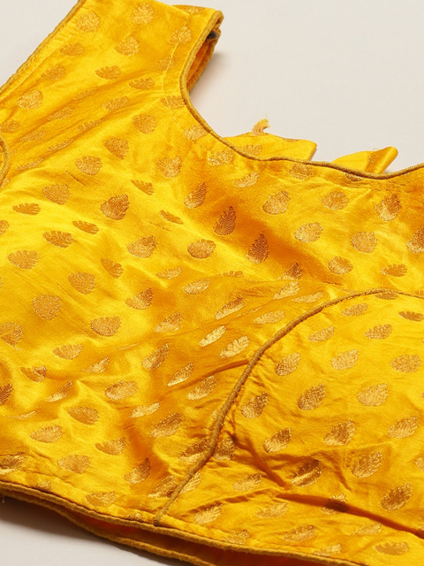 Yellow and golden woven design blouse, has a round neck, short sleeves