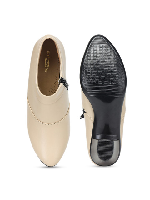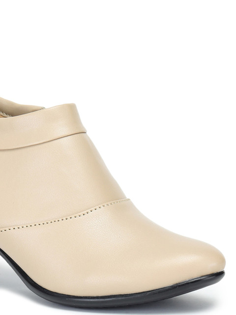 A pair of cream-coloured block boots, has regular ankle and zip clousre