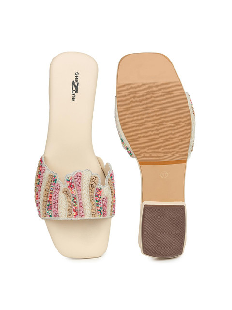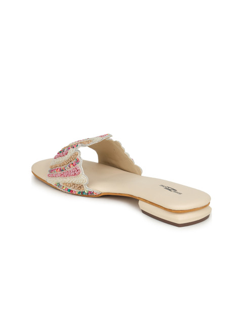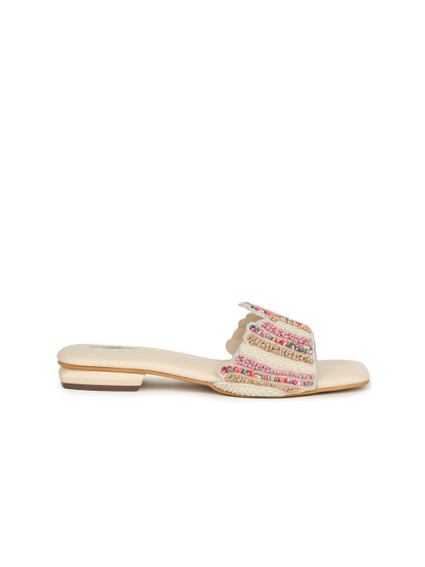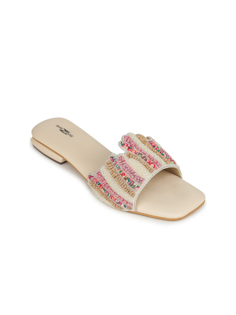 A pair of cream-coloured and pink embellished open toe flats